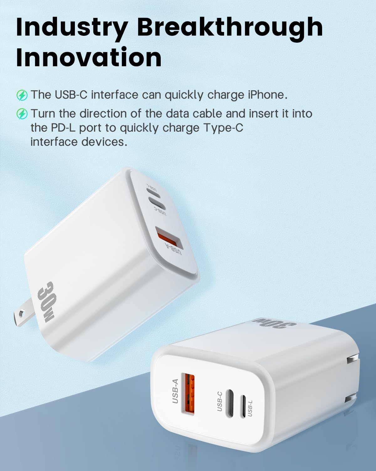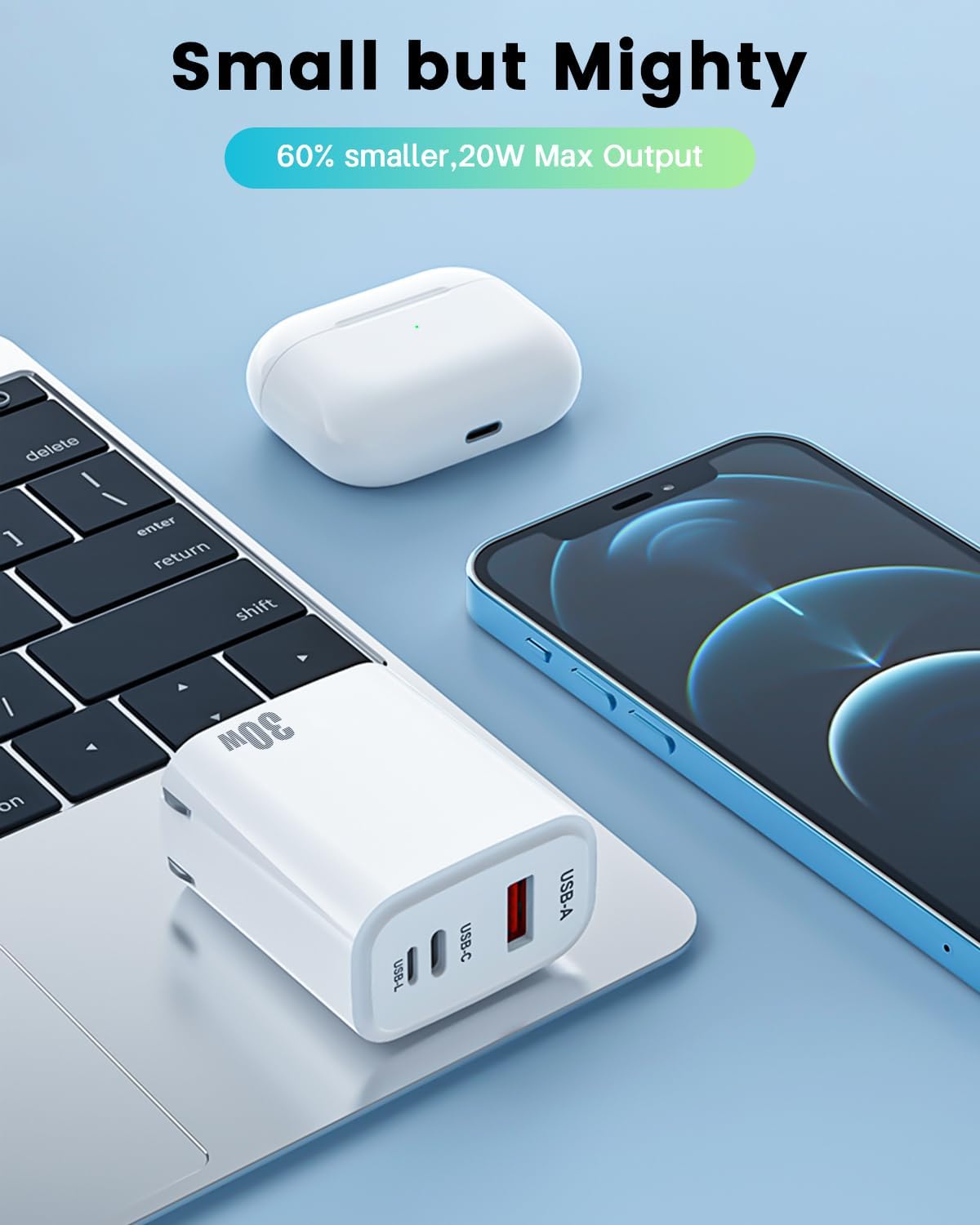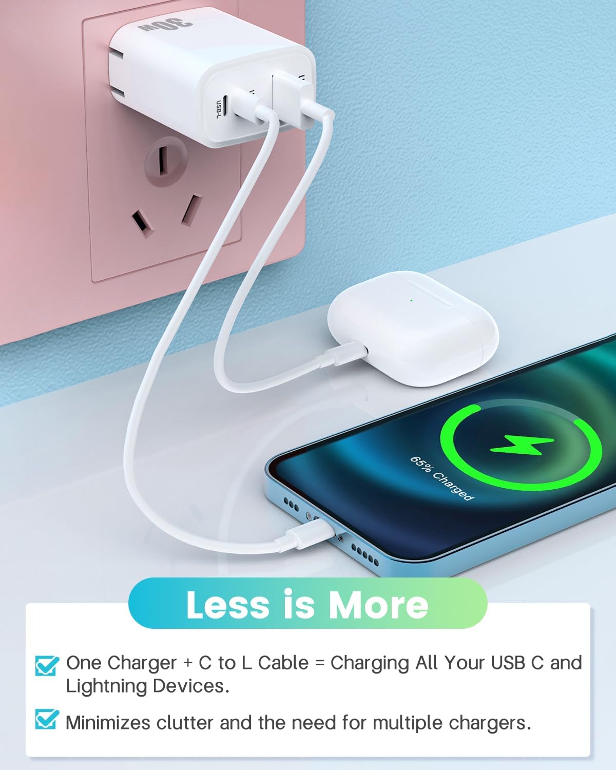 30W Wall Charger with USB/Type-C / Lightning 3 Outputs Support Android Phone and Iphone Fast Charging