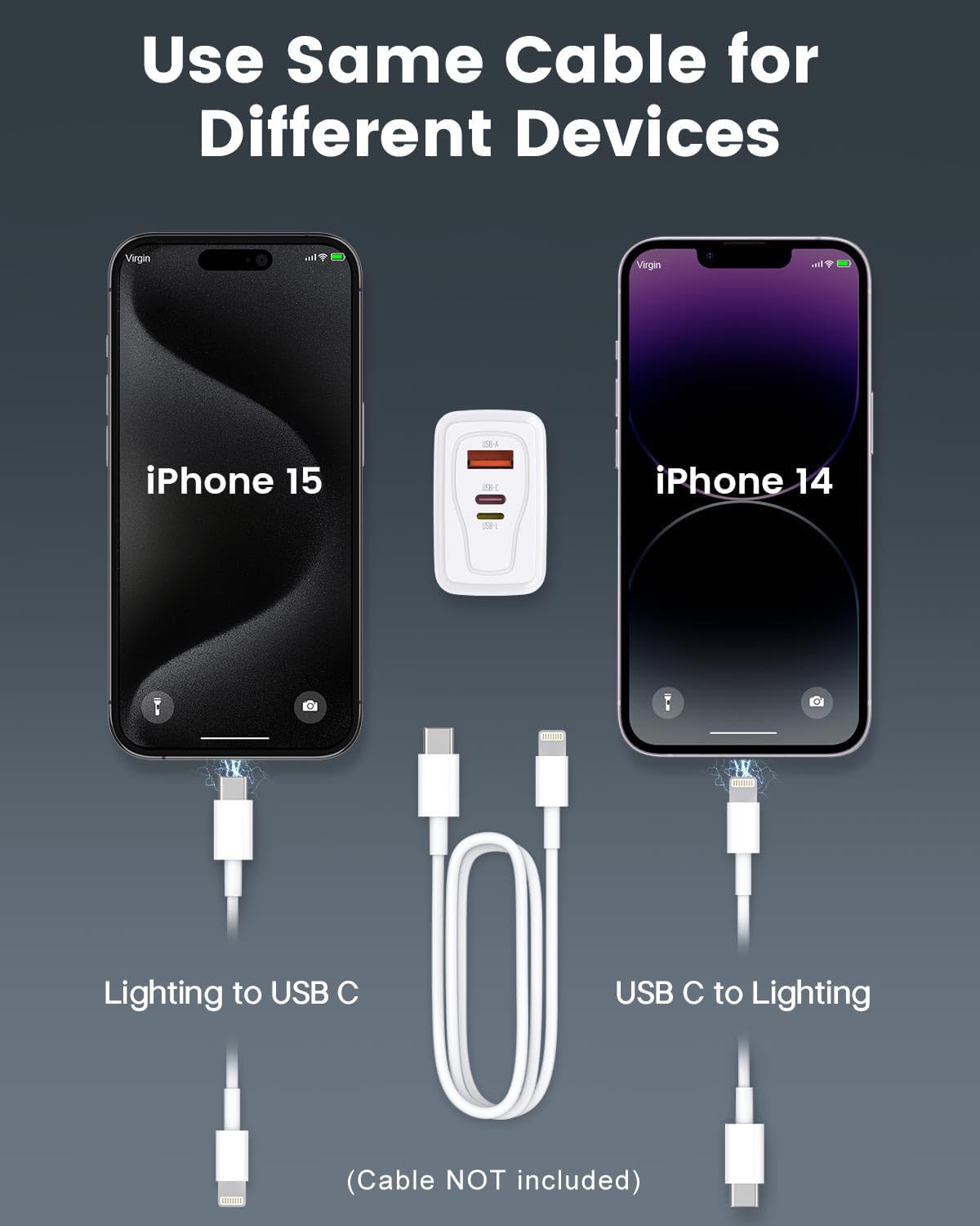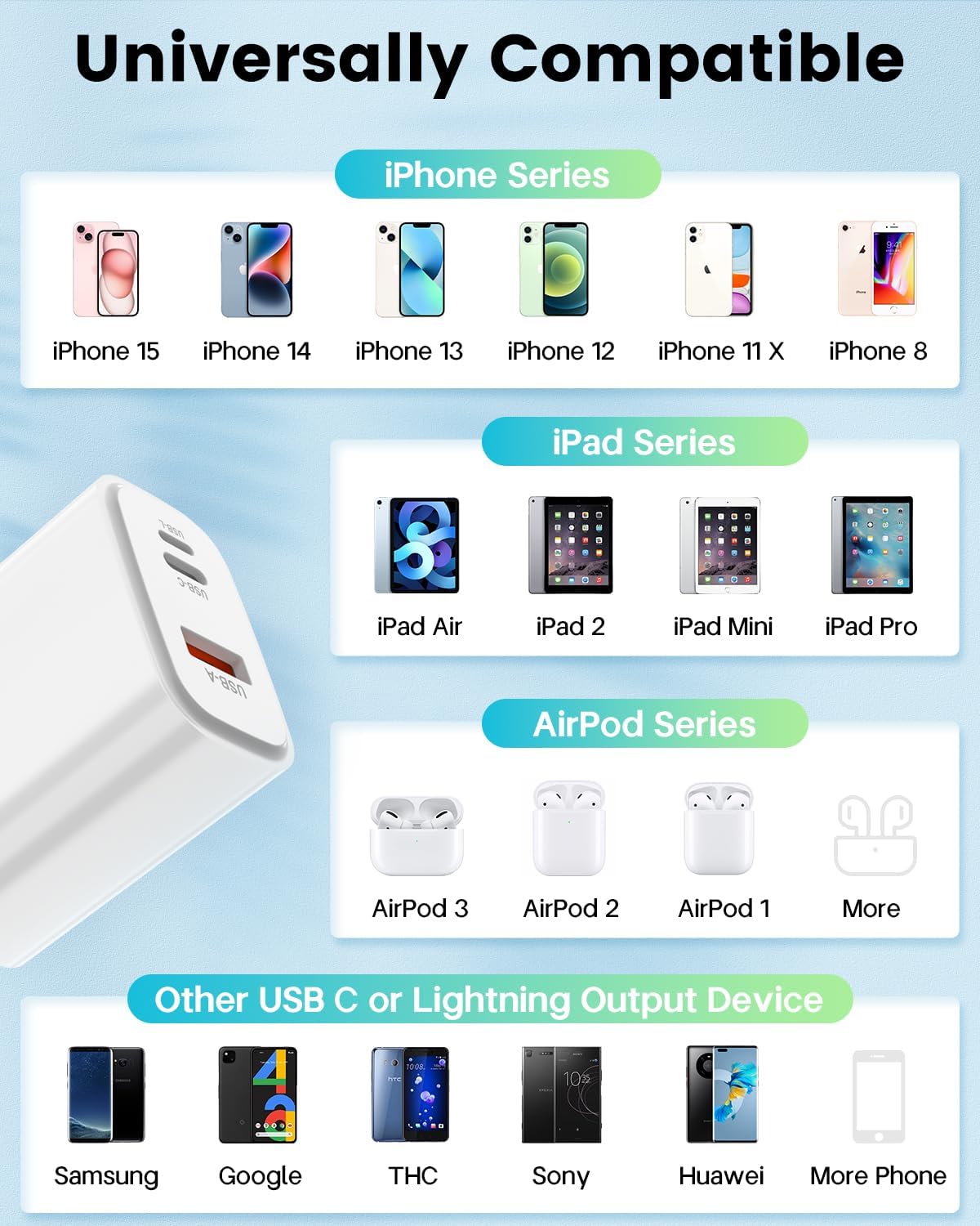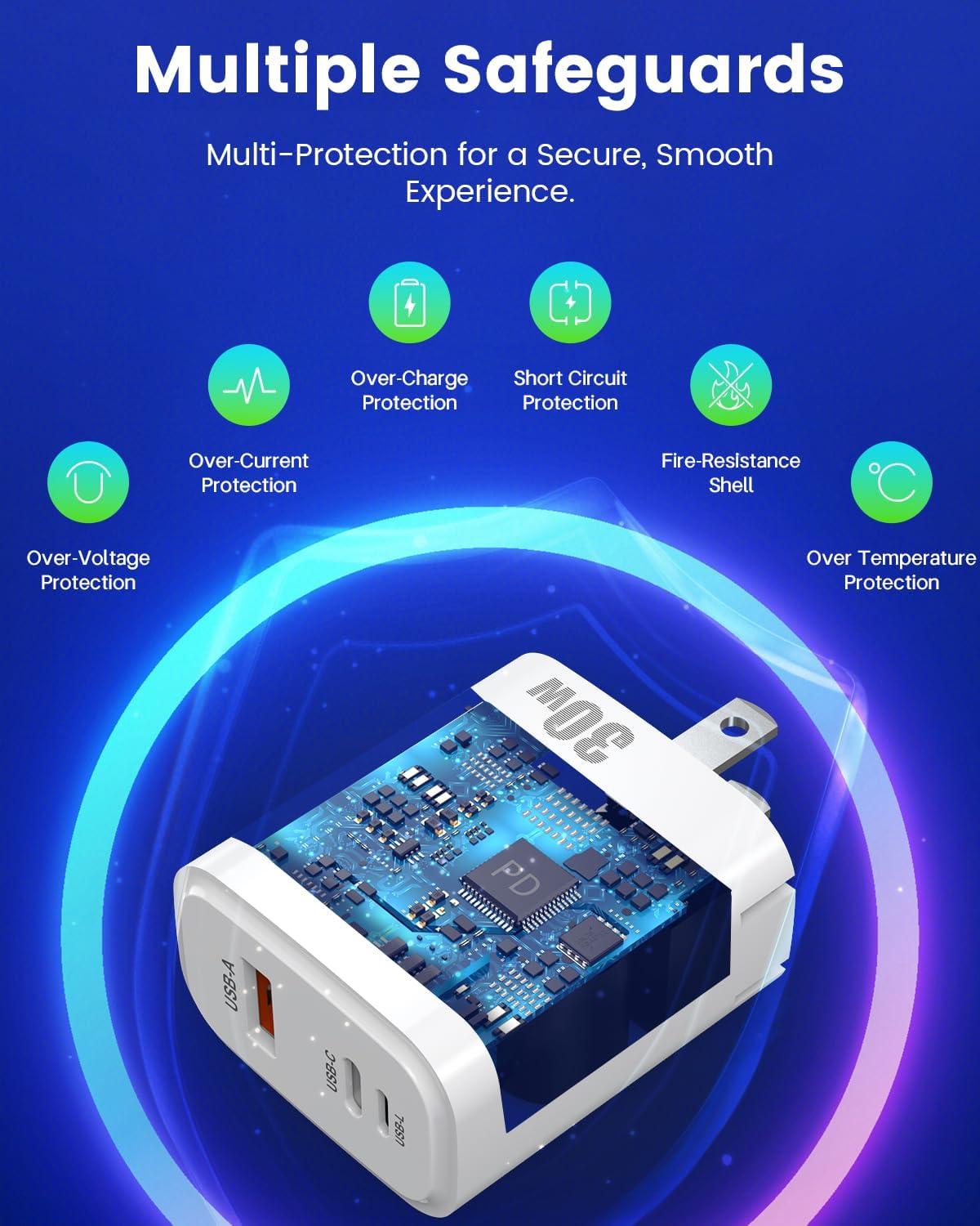 30W Wall Charger with USB/Type-C / Lightning 3 Outputs Support Android Phone and Iphone Fast Charging